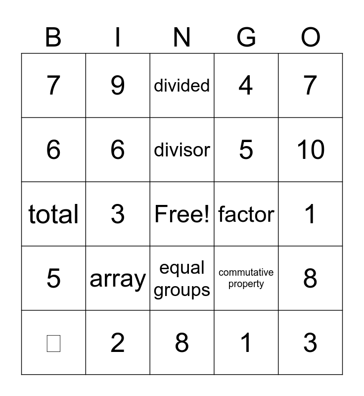 This bingo card has a free space and 32 words: 1, 2, 3, 4, 5, 6, 7, 8, 9, 10, divisor, divided, quotient, product, factor, ÷, ⟌, total, equal groups, array, commutative property, distributive property, 1, 2, 3, 4, 5, 6, 7, 8, 9 and 10.