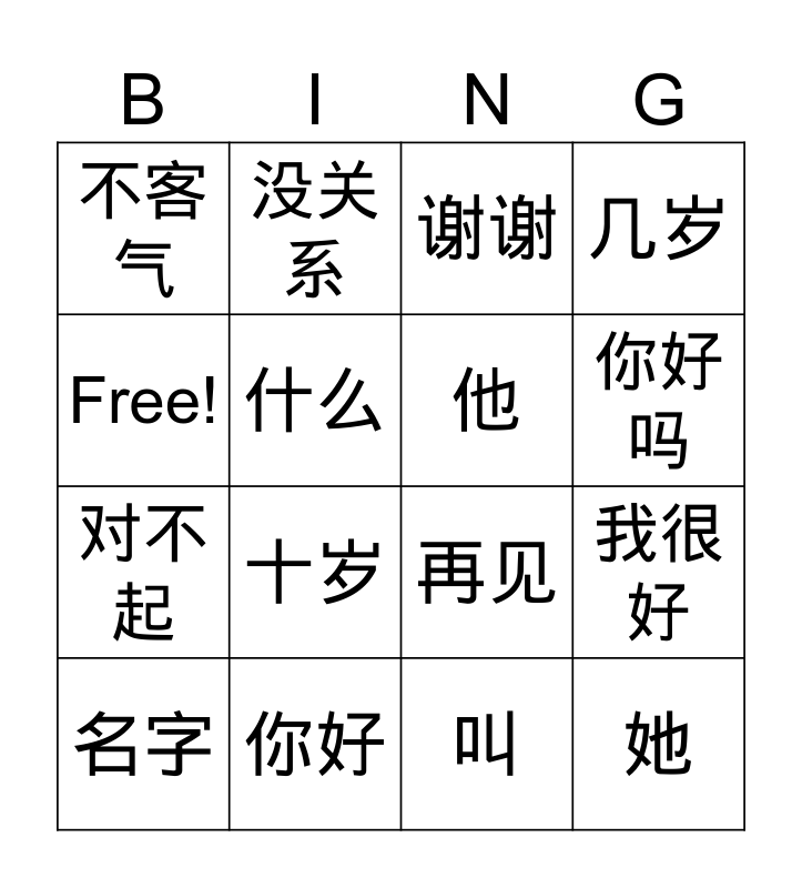 This bingo card has 16 words: 你好, 我很好, 谢谢, 不客气, 对不起, 没关系, 再见, 叫, Free!, 什么, 名字, 几岁, 十岁, 你好吗, 他 and 她.