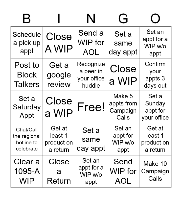 This bingo card has a free space and 24 words: Get at least 1 product on a return, Close a Return, Recognize a peer in your office huddle, Clear a 1095-A WIP, Set an appt for a WIP w/o appt, Schedule a pick up appt, Post to Block Talkers, Close A WIP, Make 5 appts from Campaign Calls, Set a same day appt, Close a WIP, Set a Saturday Appt, Set an appt for WIP w/o appt, Get at least 1 product on a return, Get a google review, Send WIP for AOL, Set a Sunday appt for your office, Send a WIP for AOL, Confirm your appts 3 days out, Close a WIP, Make 10 Campaign Calls, Chat/Call the regional hotline to celebrate, Set a same day appt and Set an appt for a WIP w/o appt.