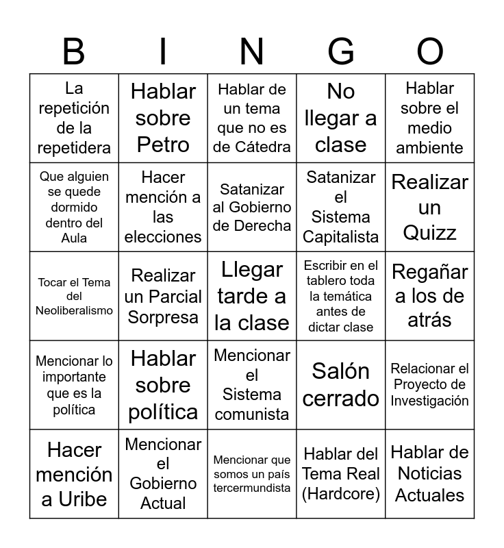 This bingo card has a free space and 24 words: Hablar sobre política, Mencionar el Gobierno Actual, Satanizar al Gobierno de Derecha, Hacer mención a Uribe, Hablar sobre el medio ambiente, La repetición de la repetidera, Que alguien se quede dormido dentro del Aula, Hablar sobre Petro, Escribir en el tablero toda la temática antes de dictar clase, Mencionar el Sistema comunista, Satanizar el Sistema Capitalista, Tocar el Tema del Neoliberalismo, Salón cerrado, Relacionar el Proyecto de Investigación, Hacer mención a las elecciones, Hablar del Tema Real (Hardcore), Regañar a los de atrás, Hablar de un tema que no es de Cátedra, Realizar un Quizz, Realizar un Parcial Sorpresa, Hablar de Noticias Actuales, Mencionar lo importante que es la política, No llegar a clase and Mencionar que somos un país tercermundista.