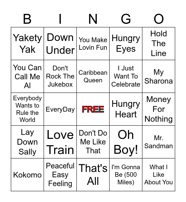 This bingo card has a free space and 78 words: Southern Nights, Sledge Hammer, You Make Lovin Fun, Rock n Roll, Hoochie Koo, Break My Stride, Dirty Laundry, Honky Cat, Doctor My Eyes, Dirty Work, End Of The Line, Stuck in the Middle With You, You Got It, Hungry Eyes, Yakety Yak, I Get The Sweetest Feeling, You Can Call Me Al, Kodachrome, Love Train, Private Eyes, Money For Nothing, De do do do, De da da da, Hold The Line, Everybody Wants to Rule the World, Caribbean Queen, Don't Rock The Jukebox, East Bound & Down, Let Your Love Flow, The Fireman, Pop A Top, Owner of a Lonely Heart, My Sharona, Cold as Ice, That's All, You Dropped a Bomb on Me, Kokomo, Hungry Heart, Abracadabra, Power of Love, Rasberry Beret, What I Like About You, Let's Dance, Little Lies, It's Still Rock n Roll To Me, Love Shack, Walk Like an Egyptian, Down Under, Working For The Weekend, Red Red Wine, Whip It, Talking In Your Sleep, Mr. Sandman, EveryDay, Oh Boy!, Jump in The Line, It's Your Thing, Baby Love, Isn't She Lovely, Saturday in The Park, Electric Avenue, Don't Do Me Like That, I Just Want To Celebrate, China Grove, Running on Empty, Mr. Big Stuff, Jungle Love, Black Water, Hey Good Lookin', Cocaine, Lay Down Sally, Peaceful Easy Feeling, Sister Golden Hair, I'm So Excited, Bad Moon Rising, Give A Little Bit, I'm Gonna Be (500 Miles), The Best, Sharp Dressed Man and Got My Mind Set on You.