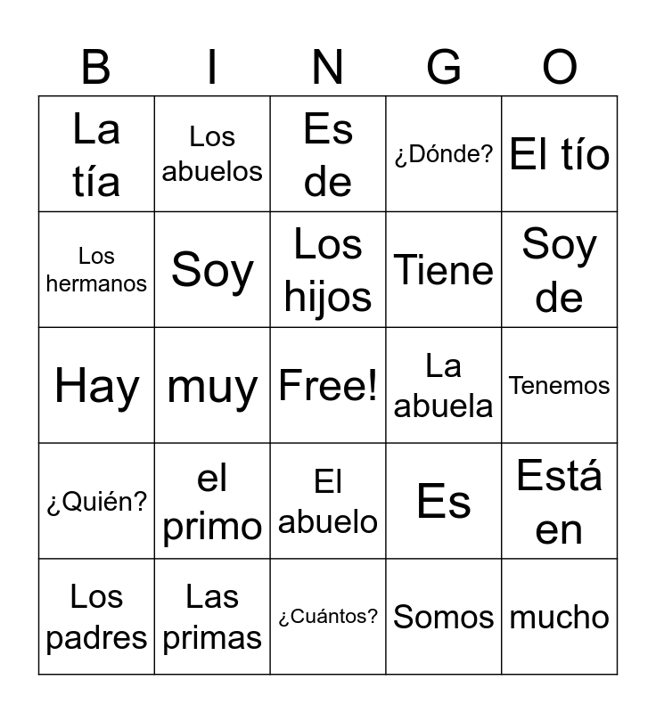 This bingo card has a free space and 24 words: el primo, Las primas, Los hijos, Los padres, El tío, La tía, Los hermanos, Los abuelos, La abuela, El abuelo, Tiene, Hay, Es, Está en, Soy, Somos, Tenemos, Es de, Soy de, muy, mucho, ¿Quién?, ¿Dónde? and ¿Cuántos?.