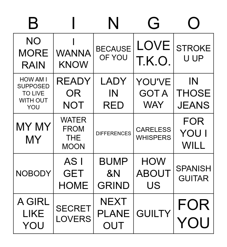 This bingo card has 31 words: NEXT PLANE OUT, WATER RUNS DRY, WATER FROM THE MOON, ROCK WITH ME, NO MORE RAIN, BECAUSE OF YOU, READY OR NOT, HOW ABOUT US, CARELESS WHISPERS, GUILTY, FOR YOU I WILL, DIFFERENCES, FOR YOU, NICE & SLOW, IN THOSE JEANS, ONE IN A MILLION, SPANISH GUITAR, AS I GET HOME, NOBODY, BUMP &N GRIND, STROKE U UP, SWEET LADY, A GIRL LIKE YOU, I WANNA KNOW, YOU'VE GOT A WAY, HOW AM I SUPPOSED TO LIVE WITH OUT YOU, LOVE T.K.O., MY MY MY, SECRET LOVERS, LADY IN RED and MY FIRST LOVE.
