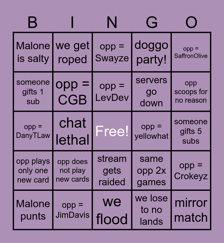This bingo card has a free space and 24 words: opp does not play new cards, opp = JimDavis, opp = LevDev, Malone punts, opp = SaffronOlive, Malone is salty, someone gifts 1 sub, we get roped, opp = yellowhat, stream gets raided, servers go down, opp = DanyTLaw, same opp 2x games, opp = Crokeyz, opp = CGB, we lose to no lands, someone gifts 5 subs, opp = Swayze, opp scoops for no reason, chat lethal, mirror match, opp plays only one new card, doggo party! and we flood.