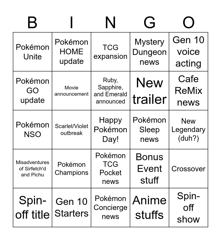 This bingo card has a free space and 24 words: Pokémon Champions, Gen 10 Starters, Ruby, Sapphire, and Emerald announced, Spin-off title, Gen 10 voice acting, Pokémon Unite, Pokémon GO update, Pokémon HOME update, Pokémon Sleep news, Pokémon TCG Pocket news, New trailer, Pokémon NSO, Bonus Event stuff, Crossover, Movie announcement, Anime stuffs, New Legendary (duh?), TCG expansion, Cafe ReMix news, Scarlet/Violet outbreak, Spin-off show, Misadventures of Sirfetch'd and Pichu, Mystery Dungeon news and Pokémon Concierge news.