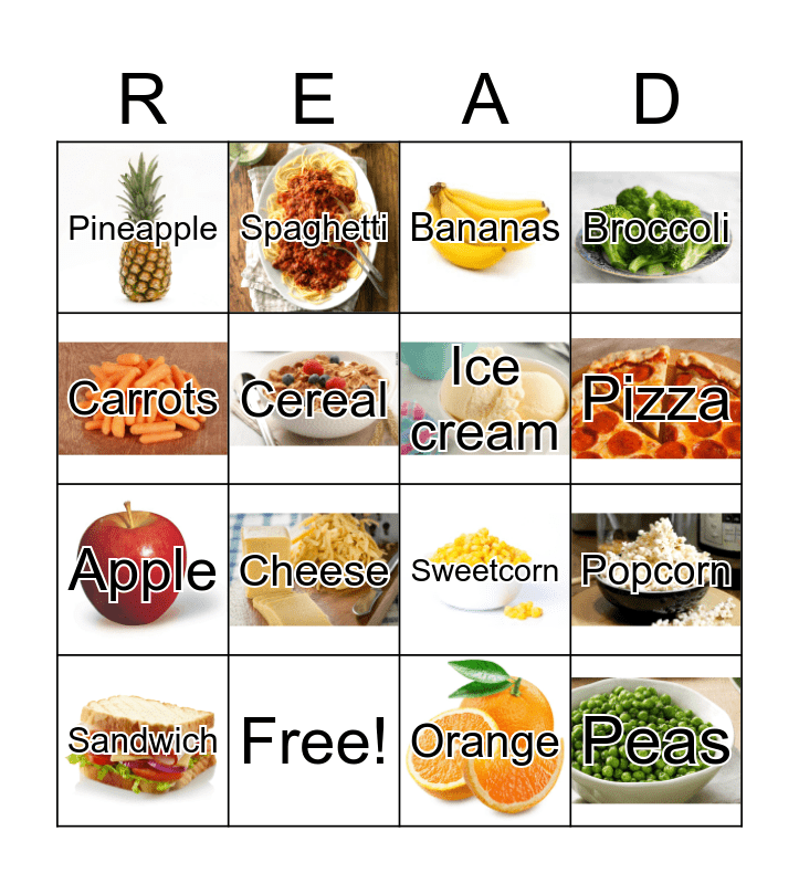 This bingo card has 27 images and 28 words: Cake, Tacos, Apple, Milkshake, Cereal, Bananas, Spaghetti, Peas, Free!, Chicken Nuggets, Sweetcorn, Broccoli, Steak, Salad, Cheese, Chips, Egg, Ice cream, Pizza, Hot dog, Pineapple, Pancakes, Sandwich, Popcorn, Orange, Cookies, Carrots and Bread.