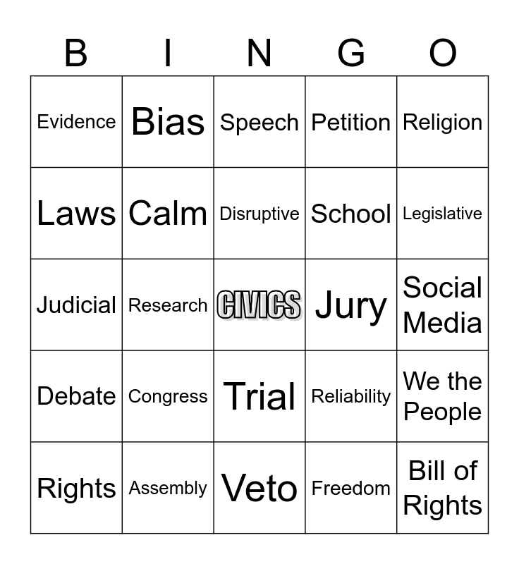 This bingo card has a free space and 44 words: Constitution, Bill of Rights, Amendment, Rights, Liberty, Freedom, Speech, Press, Religion, Assembly, Petition, Jury, Trial, Congress, Senate, Veto, Ratify, Judicial, Executive, Legislative, Bias, Credibility, Source, Evidence, Verify, Social Media, Current, Perspective, Reliability, Debate, Opinion, We the People, Evaluate, Argument, Research, Responsibilities, Private Property, School, Disruptive, Laws, School, Effort, Calm and Predictable.