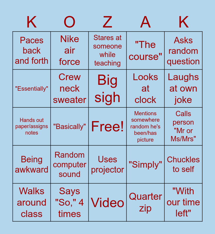 This bingo card has a free space and 45 words: "Maybe", "With our time left", Calls someone out, Walks around class, "Possibly", Quarter zip, Stares at someone while teaching, Uses people for example, Asks random question, Says "So," 4 times, "The course", Mentions somewhere random he's been/has picture, Uses projector, Random computer sound, "Ultimately", Video, Goofy slideshow, Hands out paper/assigns notes, Joke that gets crickets, Laughs at own joke, Nike air force, Dress shoes, Tie, Paces back and forth, Firmly holds mouse, Calls person "Mr or Ms/Mrs", Compares topic to something completely unrelated, Hand clasp, "Simply", Being awkward, Awkward smile, Chuckles to self, Walks around class aimlessly, "Necessarily", Randomly starts a conversation with someone, "Basically", "And with that", "For about __ or so minutes here", Compares history to today, Big sigh, "Essentially", Looks at clock, Retreats to the back of the room during video, Crew neck sweater and Goes through slideshow really fast trying to find something.