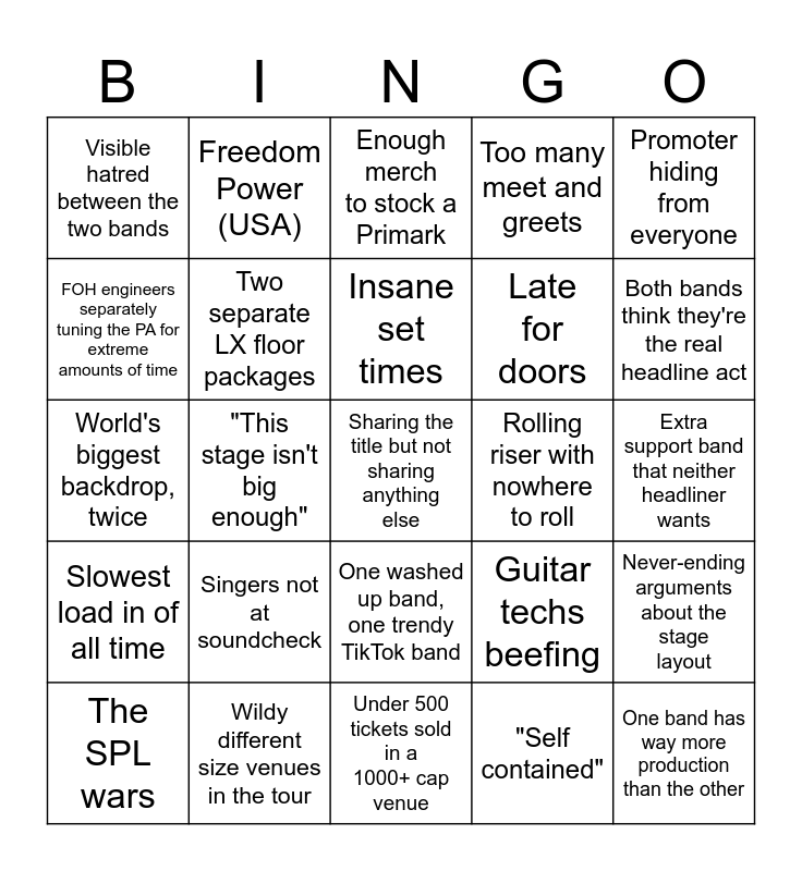 This bingo card has a free space and 24 words: Singers not at soundcheck, Wildy different size venues in the tour, Insane set times, The SPL wars, Promoter hiding from everyone, Visible hatred between the two bands, FOH engineers separately tuning the PA for extreme amounts of time, Freedom Power (USA), Rolling riser with nowhere to roll, One washed up band, one trendy TikTok band, Late for doors, World's biggest backdrop, twice, Guitar techs beefing, Never-ending arguments about the stage layout, Two separate LX floor packages, "Self contained", Extra support band that neither headliner wants, Enough merch to stock a Primark, Both bands think they're the real headline act, "This stage isn't big enough", One band has way more production than the other, Slowest load in of all time, Too many meet and greets and Under 500 tickets sold in a 1000+ cap venue.