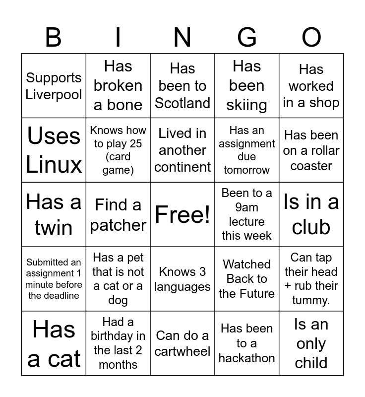 This bingo card has a free space and 74 words: Who found a dial made of gold, Get Kelvin's autograph, Has been to Scotland, Blew up a capacitor, Working on the drum machine, Is ready for the Physics theme quiz, Changed degree, Has a dog, Has a cat, Has failed a module, Takes the E2, Lives in Lucan, Lived in another continent, Uses Linux, Is not studying engineering, Find a patcher, Offer Joe a haribo, Has been on a rollar coaster, Who has a 3D printer, Has a twin, Knows how to play 25 (card game), Has broken a bone, Has been skiing, Has a summer birthday, Is an only child, Was on the Elec Soc committee last year, Is on Elec Soc Committee, Can eat with chopsticks, Had braces, Has ridden a horse, Has worked in a shop, Has worked in a restraunt, Has given grinds, Did not do the Junior Certificate, Plays on a team sport, Has been to a hackathon, Has been to all the MakerLabs, Commutes over 30 minutes, Pulled an all-nighter this semester, Member of another society committee, Can do a cartwheel, Had a birthday in the last 2 months, Is wearing a watch, Can do 5 push-ups, Has blue eyes, Supports Liverpool, Can perform a dance move, Has a pet that is not a cat or a dog, Can touch their toes, Likes to swim, Has received an award, Has a sister, Is in a club, Can say the alphabet backwards, Can play a musical instrument, Is wearing something red, Knows 3 languages, Is left-handed or left-footed, Has been to 5 foreign countries, Can tap their head + rub their tummy., Has an assignment due tomorrow, Been to all their lectures this week, Submitted an assignment 1 minute before the deadline, Fallen asleep in a lecture, Been to a 9am lecture this week, Enjoyed a group assignment, Has ran 5km, Read Harry Potter, Watched Back to the Future, Been to a concert, Been volunteering, Watched House MD, Ask Ben a question about turnips and Uses Solidworks.