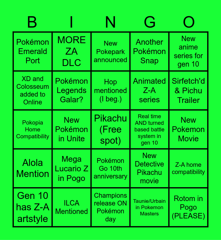 This bingo card has a free space and 24 words: Mega Lucario Z in Pogo, ILCA Mentioned, Hop mentioned (I beg.), Gen 10 has Z-A artstyle, New anime series for gen 10, Pokémon Emerald Port, XD and Colosseum added to Online, MORE ZA DLC, Real time AND turned based battle system in gen 10, Pokémon Go 10th anniversary, Animated Z-A series, Pokopia Home Compatibility, New Detective Pikachu movie, Z-A home compatibility, Pokémon Legends Galar?, Taunie/Urbain in Pokemon Masters, New Pokemon Movie, New Pokepark announced, Sirfetch'd & Pichu Trailer, New Pokémon in Unite, Rotom in Pogo (PLEASE), Alola Mention, Another Pokémon Snap and Champions release ON Pokémon day.