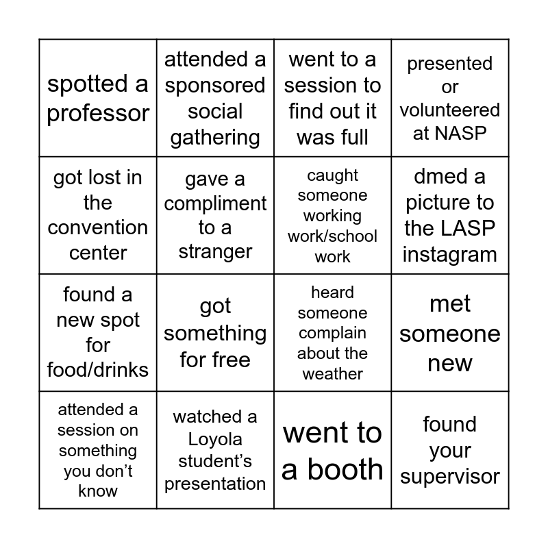 This bingo card has 16 words: watched a Loyola student’s presentation, met someone new, went to a session to find out it was full, spotted a professor, found a new spot for food/drinks, attended a sponsored social gathering, heard someone complain about the weather, went to a booth, got lost in the convention center, gave a compliment to a stranger, attended a session on something you don’t know, presented or volunteered at NASP, got something for free, dmed a picture to the LASP instagram, caught someone working work/school work and found your supervisor.
