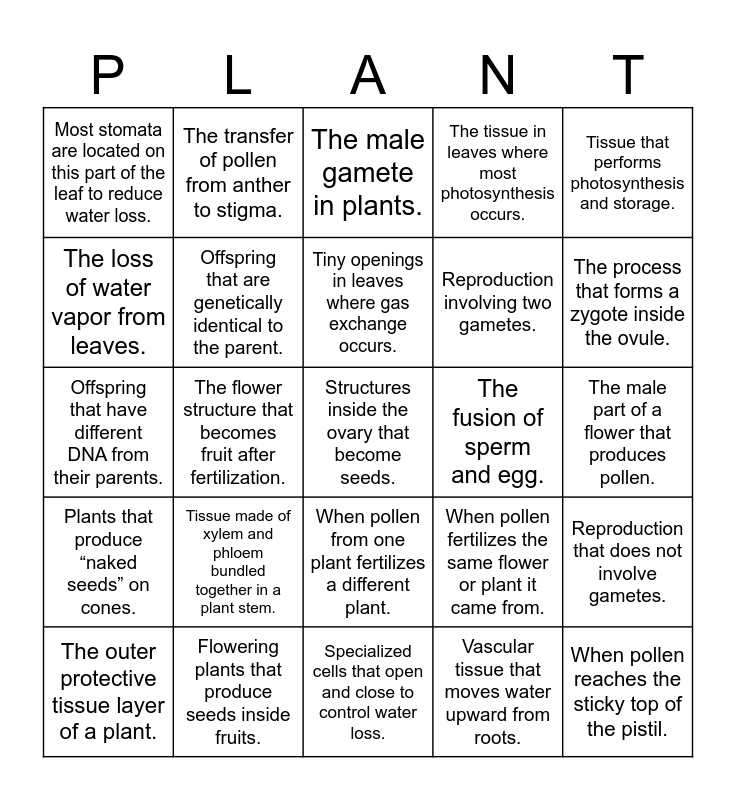 This bingo card has 25 words: Tissue made of xylem and phloem bundled together in a plant stem., Specialized cells that open and close to control water loss., Tiny openings in leaves where gas exchange occurs., The outer protective tissue layer of a plant., Tissue that performs photosynthesis and storage., Most stomata are located on this part of the leaf to reduce water loss., The loss of water vapor from leaves., The transfer of pollen from anther to stigma., The fusion of sperm and egg., When pollen from one plant fertilizes a different plant., Reproduction involving two gametes., Offspring that have different DNA from their parents., When pollen fertilizes the same flower or plant it came from., Reproduction that does not involve gametes., Offspring that are genetically identical to the parent., When pollen reaches the sticky top of the pistil., The male part of a flower that produces pollen., The male gamete in plants., The process that forms a zygote inside the ovule., The flower structure that becomes fruit after fertilization., Structures inside the ovary that become seeds., Flowering plants that produce seeds inside fruits., Plants that produce “naked seeds” on cones., The tissue in leaves where most photosynthesis occurs. and Vascular tissue that moves water upward from roots..