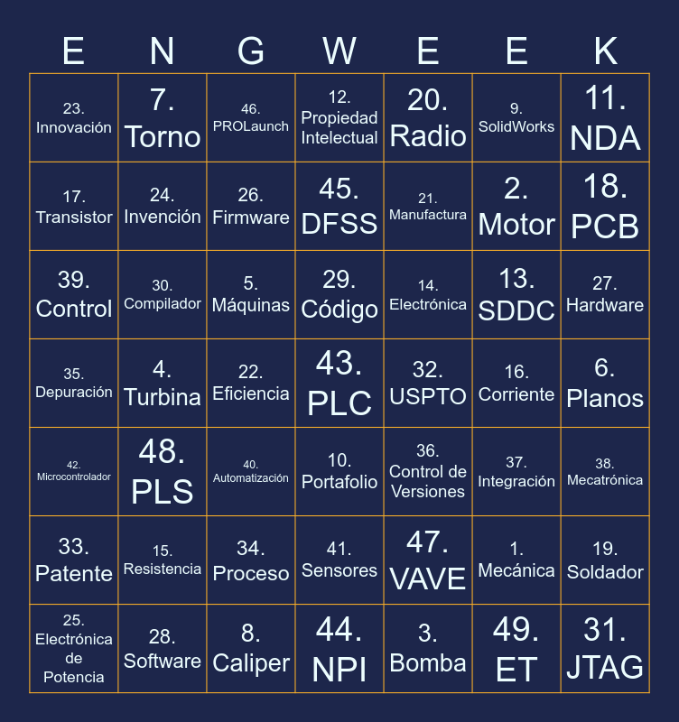 This bingo card has 49 words: 1. Mecánica, 2. Motor, 3. Bomba, 4. Turbina, 5. Máquinas, 6. Planos, 7. Torno, 8. Caliper, 9. SolidWorks, 10. Portafolio, 11. NDA, 12. Propiedad Intelectual, 13. SDDC, 14. Electrónica, 15. Resistencia, 16. Corriente, 17. Transistor, 18. PCB, 19. Soldador, 20. Radio, 21. Manufactura, 22. Eficiencia, 23. Innovación, 24. Invención, 25. Electrónica de Potencia, 26. Firmware, 27. Hardware, 28. Software, 29. Código, 30. Compilador, 31. JTAG, 32. USPTO, 33. Patente, 34. Proceso, 35. Depuración, 36. Control de Versiones, 37. Integración, 38. Mecatrónica, 39. Control, 40. Automatización, 41. Sensores, 42. Microcontrolador, 43. PLC, 44. NPI, 45. DFSS, 46. PROLaunch, 47. VAVE, 48. PLS and 49. ET.