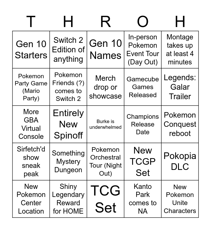 This bingo card has a free space and 24 words: Something Mystery Dungeon, Shiny Legendary Reward for HOME, Merch drop or showcase, New Pokemon Center Location, Montage takes up at least 4 minutes, Gen 10 Starters, Pokemon Party Game (Mario Party), Switch 2 Edition of anything, Champions Release Date, Pokemon Orchestral Tour (Night Out), Gamecube Games Released, More GBA Virtual Console, New TCGP Set, Pokopia DLC, Pokemon Friends (?) comes to Switch 2, Kanto Park comes to NA, Pokemon Conquest reboot, Gen 10 Names, Legends: Galar Trailer, Entirely New Spinoff, New Pokemon Unite Characters, Sirfetch'd show sneak peak, In-person Pokemon Event Tour (Day Out) and TCG Set.