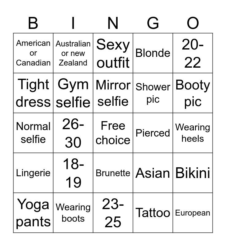 This bingo card has a free space and 24 words: 18-19, Wearing boots, Mirror selfie, Yoga pants, 20-22, American or Canadian, Tight dress, Australian or new Zealand, Pierced, Brunette, Shower pic, Normal selfie, Asian, Bikini, Gym selfie, Tattoo, Wearing heels, Sexy outfit, Booty pic, 26-30, European, Lingerie, Blonde and 23-25.
