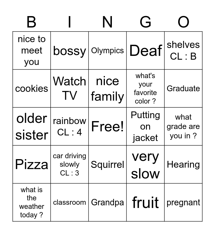 This bingo card has a free space and 24 words: car driving slowly CL : 3, classroom, nice family, what is the weather today ?, shelves CL : B, nice to meet you, cookies, bossy, Putting on jacket, Squirrel, what's your favorite color ?, older sister, very slow, Hearing, Watch TV, fruit, what grade are you in ?, Olympics, Graduate, rainbow CL : 4, pregnant, Pizza, Deaf and Grandpa.