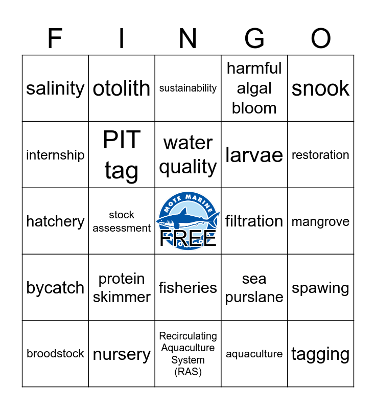 This bingo card has a free space and 26 words: fisheries, aquaculture, water quality, nursery, snook, salinity, internship, otolith, mangrove, sea purslane, larvae, hatchery, spawing, broodstock, stock assessment, habitat, harmful algal bloom, bycatch, sustainability, tagging, restoration, Recirculating Aquaculture System (RAS), filtration, protein skimmer, PIT tag and aquaponics.