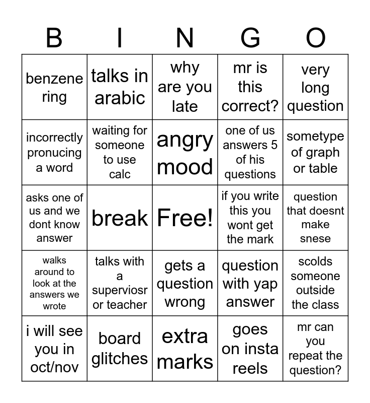 This bingo card has a free space and 24 words: talks with a superviosr or teacher, board glitches, angry mood, i will see you in oct/nov, very long question, benzene ring, incorrectly pronucing a word, talks in arabic, if you write this you wont get the mark, gets a question wrong, one of us answers 5 of his questions, asks one of us and we dont know answer, question with yap answer, scolds someone outside the class, waiting for someone to use calc, goes on insta reels, question that doesnt make snese, why are you late, sometype of graph or table, break, mr can you repeat the question?, walks around to look at the answers we wrote, mr is this correct? and extra marks.