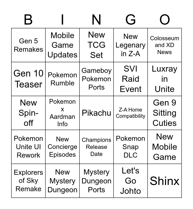 This bingo card has a free space and 24 words: New Concierge Episodes, New Mystery Dungeon, Gameboy Pokemon Ports, Explorers of Sky Remake, Colosseum and XD News, Gen 5 Remakes, Gen 10 Teaser, Mobile Game Updates, Z-A Home Compatibility, Champions Release Date, SVI Raid Event, New Spin-off, Pokemon Snap DLC, New Mobile Game, Pokemon Rumble, Let's Go Johto, Gen 9 Sitting Cuties, New TCG Set, Luxray in Unite, Pokemon x Aardman Info, Shinx, Pokemon Unite UI Rework, New Legenary in Z-A and Mystery Dungeon Ports.