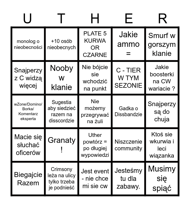 This bingo card has a free space and 24 words: Biegajcie Razem, Granaty !, Nie bójcie sie wchodzić na punkt, Jesteśmy tu dla zabawy., Smurf w gorszym klanie, monolog o nieobecności, +10 osób nieobecnych, PLATE 5 KURWA OR CZARNE, Gadka o Dissbandzie, Snajperzy są do chuja, wZone/Domino/ Borka/ Komentarz eksperta, Nooby w klanie, Niszczenie community, Ktoś sie wkurwia i leci wiązanka, Snajperzy z C widzą więcej, Crimsony leża na ulicy tylko trzeba je podnieść, Jest event - nie chce mi sie cw, Jakie ammo =, Jakie boosterki na CW wariacie ?, Macie się słuchać oficerów, Sugestia aby siedzieć razem na disscordzie, Uther powtórz = po długiej wypowiedzi, C - TIER W TYM SEZONIE and Musimy się spiąć.