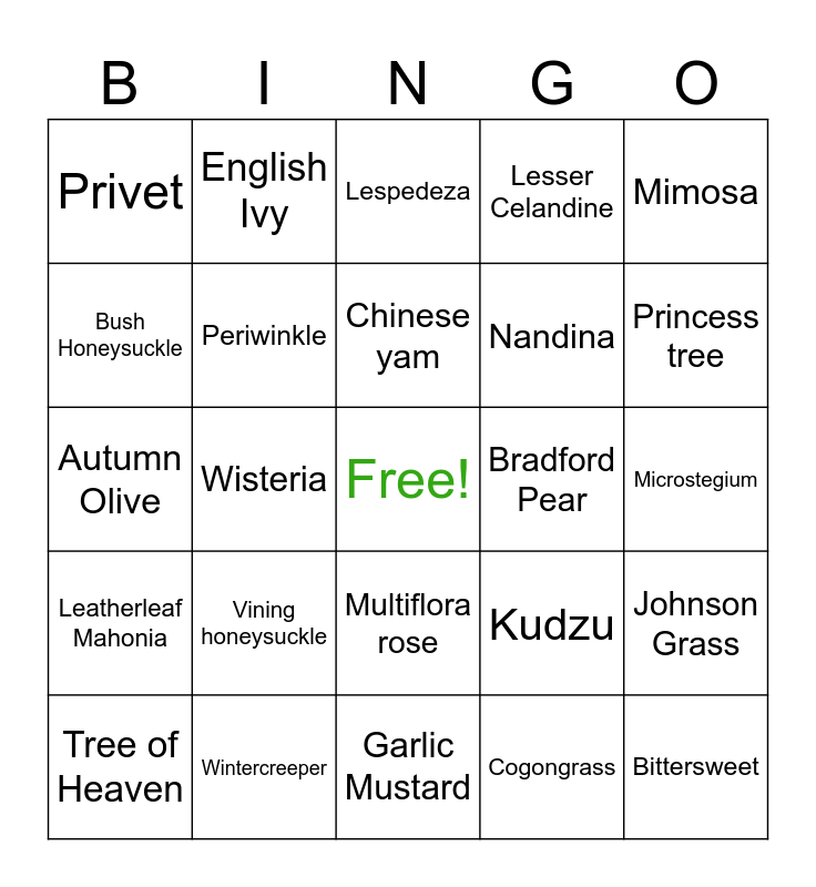 This bingo card has a free space and 24 words: Vining honeysuckle, Wintercreeper, Chinese yam, Tree of Heaven, Mimosa, Privet, Bush Honeysuckle, English Ivy, Bradford Pear, Multiflora rose, Nandina, Autumn Olive, Kudzu, Johnson Grass, Periwinkle, Cogongrass, Microstegium, Lespedeza, Princess tree, Wisteria, Bittersweet, Leatherleaf Mahonia, Lesser Celandine and Garlic Mustard.