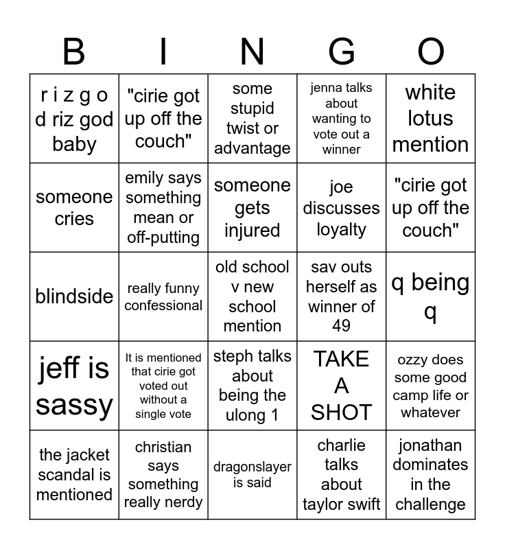 This bingo card has 25 words: It is mentioned that cirie got voted out without a single vote, dragonslayer is said, someone gets injured, the jacket scandal is mentioned, white lotus mention, r i z g o d riz god baby, someone cries, "cirie got up off the couch", sav outs herself as winner of 49, steph talks about being the ulong 1, joe discusses loyalty, blindside, TAKE A SHOT, ozzy does some good camp life or whatever, emily says something mean or off-putting, jonathan dominates in the challenge, q being q, some stupid twist or advantage, "cirie got up off the couch", really funny confessional, old school v new school mention, christian says something really nerdy, jeff is sassy, jenna talks about wanting to vote out a winner and charlie talks about taylor swift.