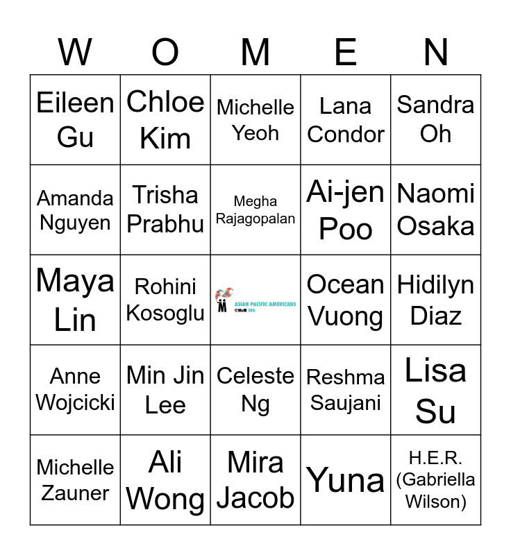 This bingo card has a free space and 43 words: Rina Sawayama, H.E.R. (Gabriella Wilson), Jhené Aiko, Michelle Zauner, Lisa (BLACKPINK), Yuna, Michelle Yeoh, Awkwafina (Nora Lum), Sandra Oh, Ali Wong, Lana Condor, Ocean Vuong, Celeste Ng, Min Jin Lee, R.F. Kuang, Mira Jacob, Jeanne Gang, Maya Lin, Kotchakorn Voraakhom, Naomi Osaka, Chloe Kim, Sunisa Lee, Lydia Ko, Eileen Gu, Alysa Liu, Hidilyn Diaz, Minjee Lee, Haunani-Kay Trask, Reshma Saujani, Anne Wojcicki, Fei-Fei Li, Lisa Su, Arati Prabhakar, Rohini Kosoglu, Maria Ressa, Amna Nawaz, Lisa Ling, Megha Rajagopalan, Amanda Nguyen, Ai-jen Poo, Kanoa Greene, Trisha Prabhu and Alofa Lalelei.