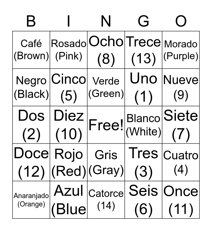 This bingo card has a free space and 24 words: Rojo (Red), Azul (Blue, Verde (Green), Anaranjado (Orange), Morado (Purple), Café (Brown), Negro (Black), Rosado (Pink), Blanco (White), Gris (Gray), Uno (1), Dos (2), Tres (3), Cuatro (4), Cinco (5), Seis (6), Siete (7), Ocho (8), Nueve (9), Diez (10), Once (11), Doce (12), Trece (13) and Catorce (14).