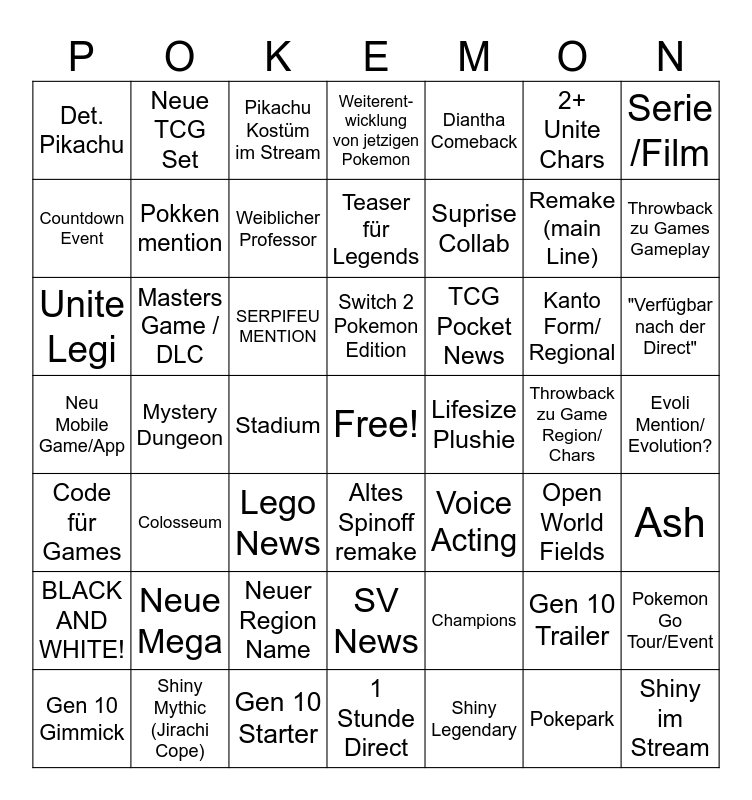 This bingo card has a free space and 48 words: Code für Games, Mystery Dungeon, Gen 10 Starter, Altes Spinoff remake, Suprise Collab, Throwback zu Game Region/ Chars, Serie /Film, Gen 10 Gimmick, Masters Game / DLC, Stadium, Weiterent- wicklung von jetzigen Pokemon, Diantha Comeback, Kanto Form/ Regional, "Verfügbar nach der Direct", Neu Mobile Game/App, Neue Mega, Pikachu Kostüm im Stream, Switch 2 Pokemon Edition, Champions, 2+ Unite Chars, Throwback zu Games Gameplay, Countdown Event, Neue TCG Set, Weiblicher Professor, Shiny Legendary, Remake (main Line), Evoli Mention/ Evolution?, BLACK AND WHITE!, Colosseum, SERPIFEU MENTION, SV News, TCG Pocket News, Gen 10 Trailer, Pokemon Go Tour/Event, Det. Pikachu, Shiny Mythic (Jirachi Cope), Lego News, 1 Stunde Direct, Lifesize Plushie, Pokepark, Ash, Unite Legi, Pokken mention, Neuer Region Name, Teaser für Legends, Voice Acting, Open World Fields and Shiny im Stream.