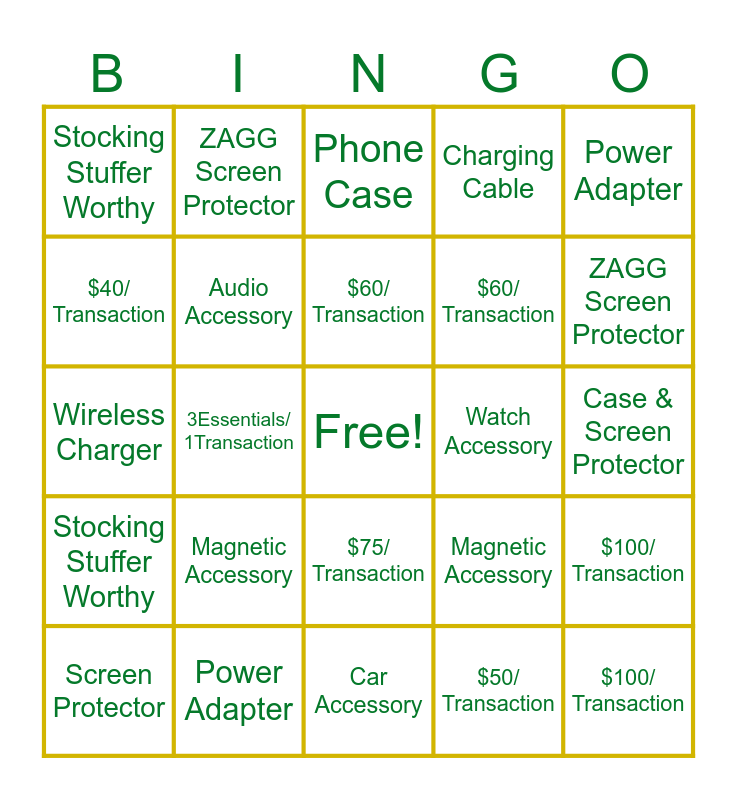 This bingo card has a free space and 28 words: $100/ Transaction, 3Essentials/ 1Transaction, $60/ Transaction, $50/ Transaction, $40/ Transaction, Phone Case, ZAGG Screen Protector, Stocking Stuffer Worthy, Watch Accessory, Screen Protector, Wireless Charger, Charging Cable, Power Adapter, Car Accessory, ZAGG Screen Protector, 3Essentials/ 1Transaction, Magnetic Accessory, Audio Accessory, $60/ Transaction, $75/ Transaction, Stocking Stuffer Worthy, Tablet Accessory, $100/ Transaction, 3Essentials/ 1Transaction, Case & Screen Protector, Magnetic Accessory, Power Adapter and $75/ Transaction.