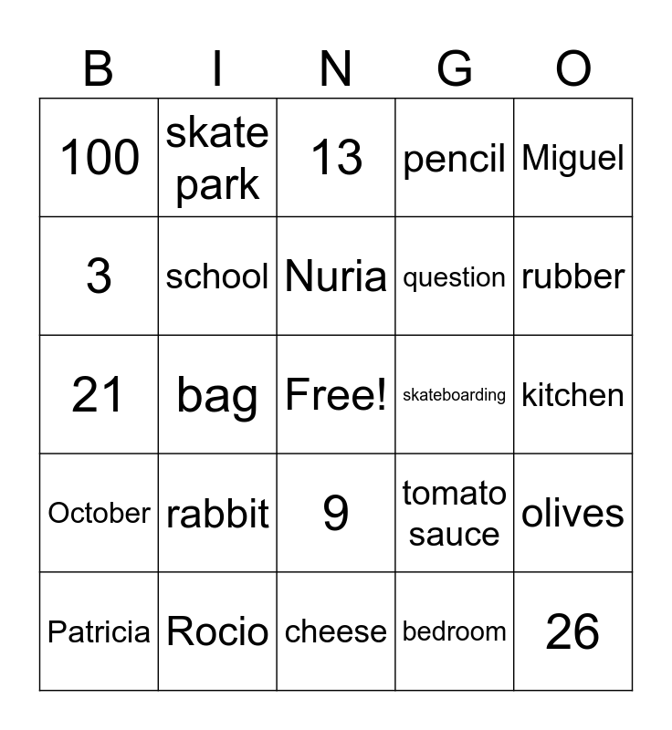 This bingo card has a free space and 24 words: rabbit, Rocio, Nuria, Patricia, Miguel, 100, 3, skate park, skateboarding, 9, question, 21, tomato sauce, olives, school, bedroom, kitchen, 13, rubber, bag, 26, October, pencil and cheese.