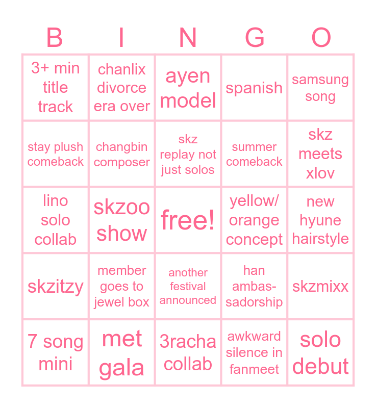 This bingo card has a free space and 24 words: member goes to jewel box, met gala, skz replay not just solos, 7 song mini, samsung song, 3+ min title track, stay plush comeback, chanlix divorce era over, yellow/ orange concept, another festival announced, summer comeback, lino solo collab, han ambas- sadorship, skzmixx, changbin composer, awkward silence in fanmeet, new hyune hairstyle, ayen model, skz meets xlov, skzoo show, solo debut, skzitzy, spanish and 3racha collab.