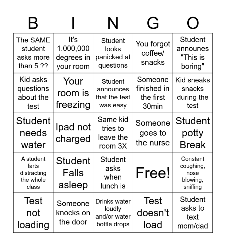 This bingo card has 25 words: Student Falls asleep, Drinks water loudly and/or water bottle drops, Student announces that the test was easy, Test not loading, Student announes "This is boring", The SAME student asks more than 5 ??, Kid asks questions about the test, It's 1,000,000 degrees in your room, Someone goes to the nurse, Student asks when lunch is, Someone finished in the first 30min, Student needs water, Free!, Constant coughing, nose blowing, sniffing, Your room is freezing, Student asks to text mom/dad, Student potty Break, Student looks panicked at questions, Kid sneaks snacks during the test, Ipad not charged, Same kid tries to leave the room 3X, Someone knocks on the door, A student farts distracting the whole class, You forgot coffee/ snacks and Test doesn't load.