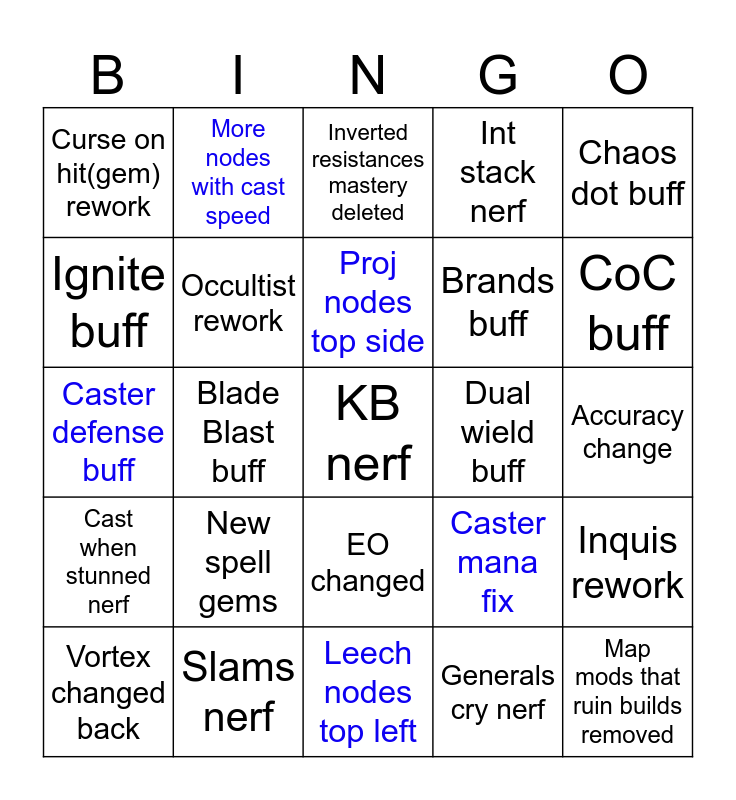 This bingo card has 25 words: New spell gems, Leech nodes top left, Proj nodes top side, Vortex changed back, Chaos dot buff, Curse on hit(gem) rework, Ignite buff, More nodes with cast speed, Dual wield buff, EO changed, Brands buff, Caster defense buff, Caster mana fix, Inquis rework, Occultist rework, Map mods that ruin builds removed, Accuracy change, Inverted resistances mastery deleted, CoC buff, Blade Blast buff, KB nerf, Slams nerf, Cast when stunned nerf, Int stack nerf and Generals cry nerf.