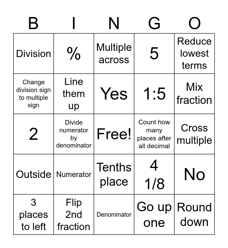 This bingo card has a free space and 29 words: 3 places to left, 3 places to right, Divide numerator by denominator, In house, Division, Multiple across, Line them up, Numerator, Count how many places after all decimal, Flip 2nd fraction, Cross multiple, Round down, Denominator, Go up one, Mix fraction, Improper fraction, Tenths place, Outside, Reduce lowest terms, 2, 4 1/8, 98/43, 1:5, Change division sign to multiple sign, 5, %, No, Yes and PRN.