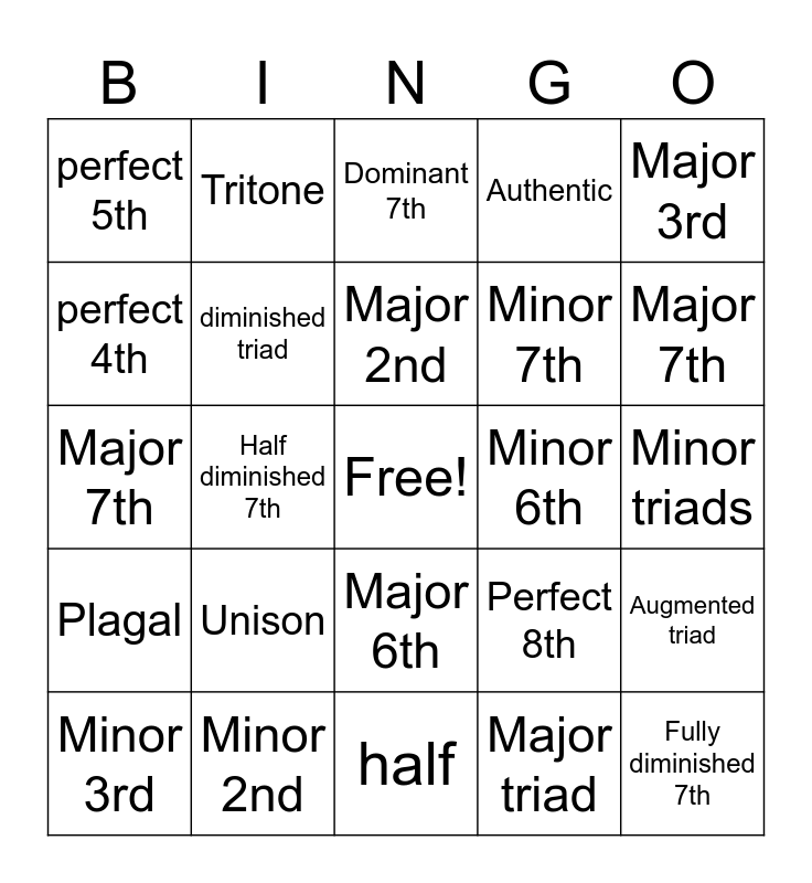 This bingo card has a free space and 24 words: Unison, Minor 2nd, Major 2nd, Minor 3rd, Major 3rd, perfect 5th, perfect 4th, Tritone, Minor 6th, Major 6th, Minor 7th, Major 7th, Perfect 8th, Augmented triad, diminished triad, Major triad, Minor triads, Dominant 7th, Major 7th, Half diminished 7th, Fully diminished 7th, Plagal, Authentic and half.