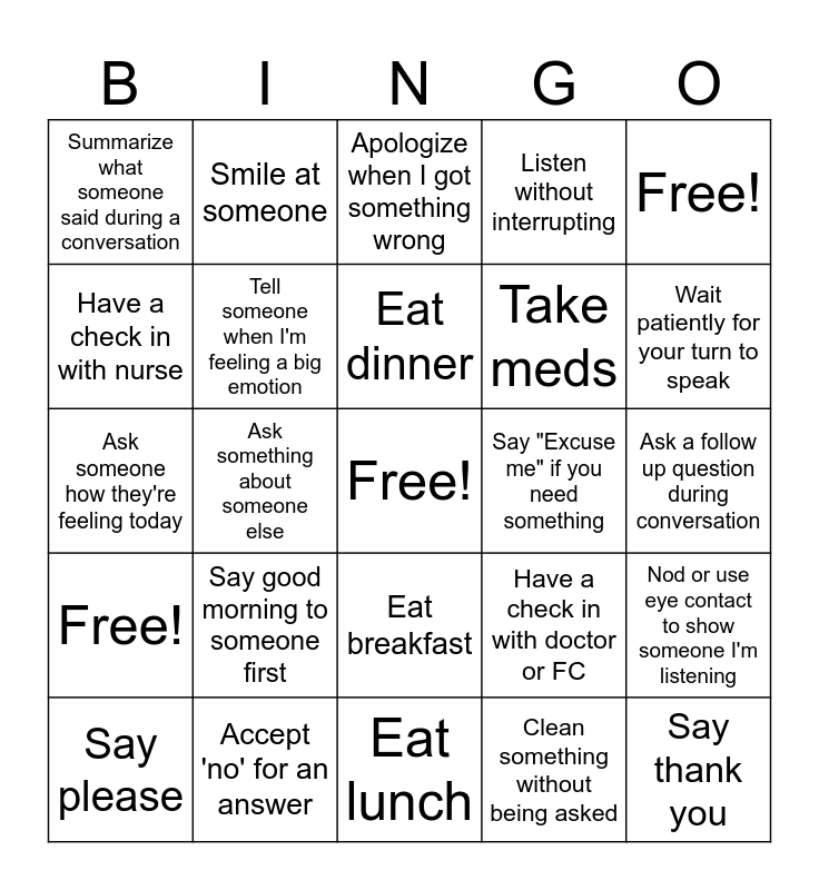 This bingo card has a free space and 24 words: Say good morning to someone first, Accept 'no' for an answer, Eat dinner, Say please, Free!, Summarize what someone said during a conversation, Have a check in with nurse, Smile at someone, Say "Excuse me" if you need something, Eat breakfast, Take meds, Ask someone how they're feeling today, Have a check in with doctor or FC, Nod or use eye contact to show someone I'm listening, Tell someone when I'm feeling a big emotion, Clean something without being asked, Ask a follow up question during conversation, Apologize when I got something wrong, Wait patiently for your turn to speak, Ask something about someone else, Say thank you, Free!, Listen without interrupting and Eat lunch.