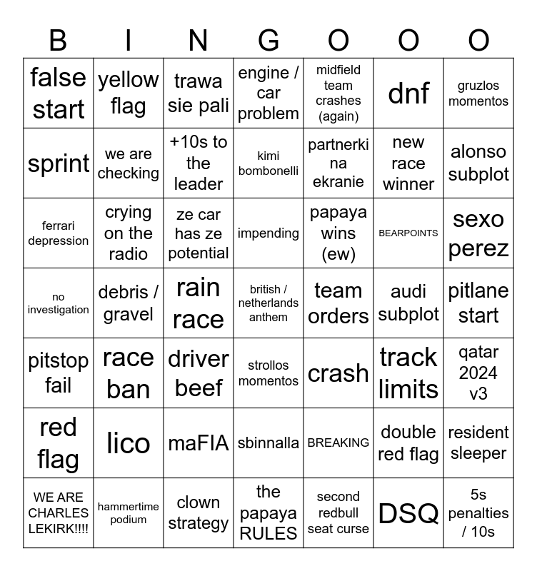 This bingo card has a free space and 62 words: WE ARE CHARLES LEKIRK!!!!, hammertime podium, FRATELLI D'ITALIA, the papaya RULES, papaya wins (ew), lando no-rizz slander, gruzlos momentos, osama bin grazel stfu, crying on the radio, clown strategy, engine / car problem, crash, dnf, pitlane start, red flag, yellow flag, trawa sie pali, kimi bombonelli, PAPAYA CRASH!!!, new race winner, sexo perez, false start, lico, ze car has ze potential, double dnf, double red flag, qatar 2024 v3, shocking q1/q2 exit, race ban, rain race, safety car / vsc, team orders, charles wdc???, 5s penalties / 10s, sprint, we are checking, maFIA, sbinnalla, midfield team crashes (again), BEARPOINTS, alonso subplot, no investigation, debris / gravel, driver switches, impending, partnerki na ekranie, track limits, resident sleeper, pitstop fail, unsafe release, +10s to the leader, strollos momentos, BREAKING, DSQ, waiting for fia documents, ferrari depression, rumours, driver beef, team beef, second redbull seat curse, audi subplot and reserve driver moment.