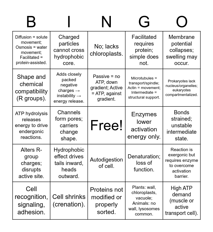 This bingo card has a free space and 24 words: Hydrophobic effect drives tails inward, heads outward., Cell shrinks (crenation)., Passive = no ATP, down gradient; Active = ATP, against gradient., Cell recognition, signaling, adhesion., Membrane potential collapses; swelling may occur., Diffusion = solute movement; Osmosis = water movement; Facilitated = protein-assisted., Shape and chemical compatibility (R groups)., Charged particles cannot cross hydrophobic core., Enzymes lower activation energy only., Autodigestion of cell., Microtubules = transport/spindle; Actin = movement; Intermediate = structural support., ATP hydrolysis releases energy to drive endergonic reactions., Denaturation; loss of function., Reaction is exergonic but requires enzyme to overcome activation barrier., Adds closely packed negative charges → instability → energy release., Plants: wall, chloroplasts, vacuole; Animals: no wall, lysosomes common., Bonds strained; unstable intermediate state., No; lacks chloroplasts., Prokaryotes lack nucleus/organelles; eukaryotes compartmentalized., Channels form pores; carriers change shape., High ATP demand (muscle or active transport cell)., Alters R-group charges; disrupts active site., Facilitated requires protein; simple does not. and Proteins not modified or properly sorted..