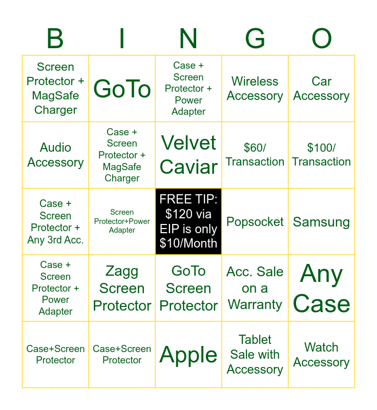 This bingo card has a free space and 29 words: Case+Screen Protector, Case+Power Adapter, Screen Protector+Power Adapter, Power Adapter + MagSafe Charger, Screen Protector + MagSafe Charger, Case + Screen Protector + Power Adapter, Case + Screen Protector + MagSafe Charger, Zagg Screen Protector, Popsocket, Case+Screen Protector, Samsung, Watch Accessory, Apple, Tablet Sale with Accessory, $100/ Transaction, Belkin, GoTo Screen Protector, Case + Screen Protector + Power Adapter, Car Accessory, Case + Screen Protector + Any 3rd Acc., Acc. Sale on a Warranty, Power Adapter, $60/ Transaction, Audio Accessory, Wireless Accessory, GoTo, Any Case, Velvet Caviar and Kate Spade.