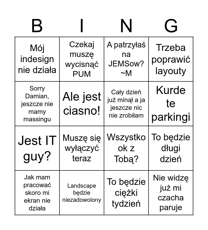 This bingo card has 16 words: Landscape będzie niezadowolony, To będzie długi dzień, A patrzyłaś na JEMSow? ~M, Mój indesign nie działa, Jest IT guy?, Czekaj muszę wycisnąć PUM, Wszystko ok z Tobą?, To będzie ciężki tydzień, Sorry Damian, jeszcze nie mamy massingu, Ale jest ciasno!, Jak mam pracować skoro mi ekran nie działa, Trzeba poprawić layouty, Muszę się wyłączyć teraz, Kurde te parkingi, Cały dzień już minął a ja jeszcze nic nie zrobiłam and Nie widzę już mi czacha paruje.