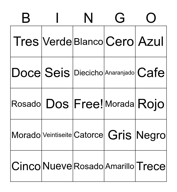 This bingo card has a free space and 24 words: Veintiseite, Nueve, Diecicho, Cinco, Azul, Tres, Doce, Verde, Morada, Catorce, Anaranjado, Rosado, Gris, Negro, Seis, Amarillo, Rojo, Blanco, Cafe, Dos, Trece, Morado, Cero and Rosado.