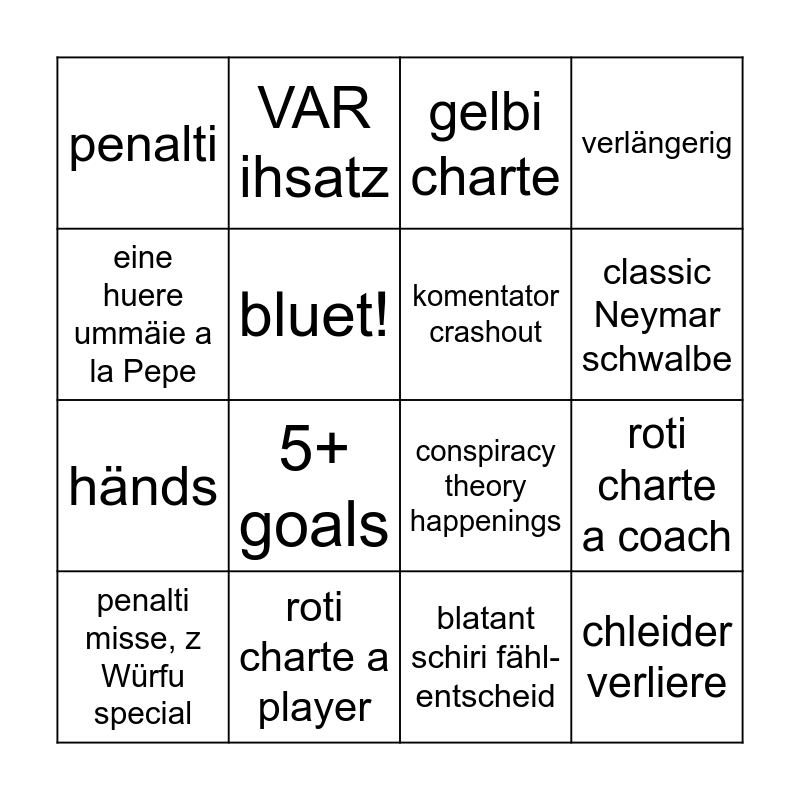 This bingo card has 16 words: roti charte a player, roti charte a coach, gelbi charte, penalti, händs, VAR ihsatz, conspiracy theory happenings, blatant schiri fähl- entscheid, eine huere ummäie a la Pepe, bluet!, penalti misse, z Würfu special, verlängerig, 5+ goals, classic Neymar schwalbe, komentator crashout and chleider verliere.
