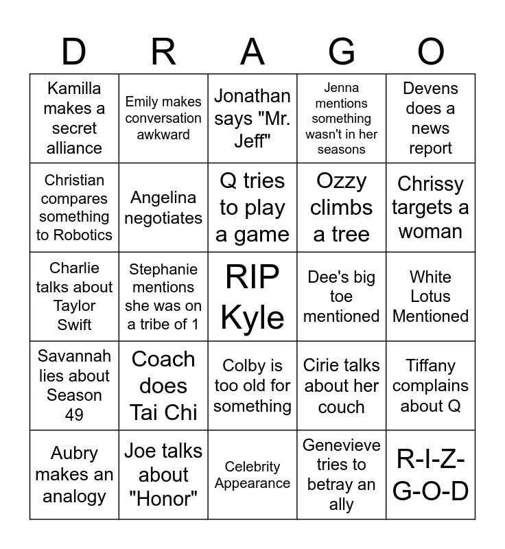 This bingo card has a free space and 24 words: Coach does Tai Chi, Joe talks about "Honor", Q tries to play a game, Aubry makes an analogy, Devens does a news report, Kamilla makes a secret alliance, Christian compares something to Robotics, Emily makes conversation awkward, Dee's big toe mentioned, Colby is too old for something, Ozzy climbs a tree, Charlie talks about Taylor Swift, Cirie talks about her couch, Tiffany complains about Q, Angelina negotiates, Genevieve tries to betray an ally, White Lotus Mentioned, Jonathan says "Mr. Jeff", Chrissy targets a woman, Stephanie mentions she was on a tribe of 1, R-I-Z-G-O-D, Savannah lies about Season 49, Jenna mentions something wasn't in her seasons and Celebrity Appearance.