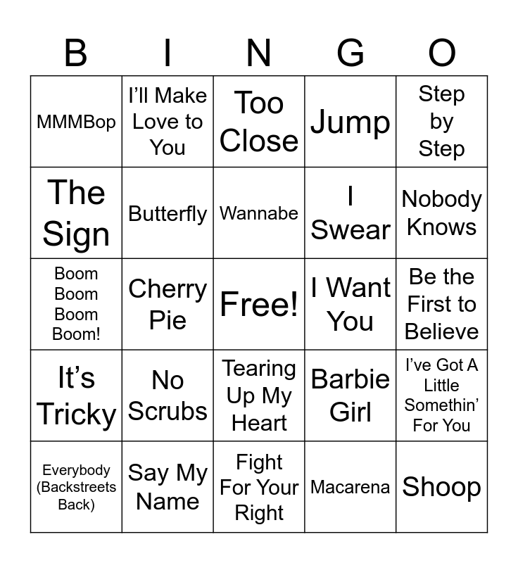 This bingo card has a free space and 24 words: No Scrubs, Say My Name, Wannabe, Everybody (Backstreets Back), Step by Step, MMMBop, The Sign, I’ll Make Love to You, I Want You, Tearing Up My Heart, I Swear, Boom Boom Boom Boom!, Barbie Girl, I’ve Got A Little Somethin’ For You, Butterfly, Macarena, Be the First to Believe, Too Close, Nobody Knows, Cherry Pie, Shoop, It’s Tricky, Jump and Fight For Your Right.