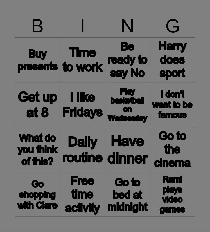 This bingo card has 16 words: Free time activity, Go to the cinema, Be ready to say No, Buy presents, What do you think of this?, Time to work, Have dinner, Go to bed at midnight, Get up at 8, I like Fridays, Go shopping with Clare, Harry does sport, Daily routine, I don't want to be famous, Play basketball on Wednesday and Rami plays video games.