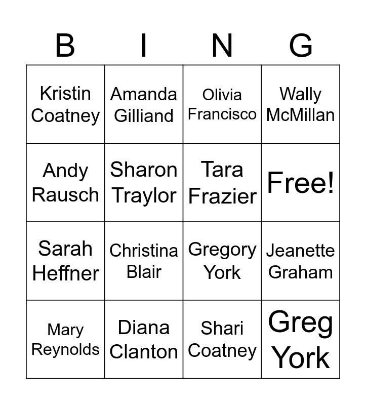 This bingo card has 17 words: Shari Coatney, Mary Reynolds, Olivia Francisco, Kristin Coatney, Christina Blair, Wally McMillan, Jeanette Graham, Tara Frazier, Free!, Sharon Traylor, Diana Clanton, Gregory York, Andy Rausch, Amanda Gilliand, Sarah Heffner, Heather House and Greg York.
