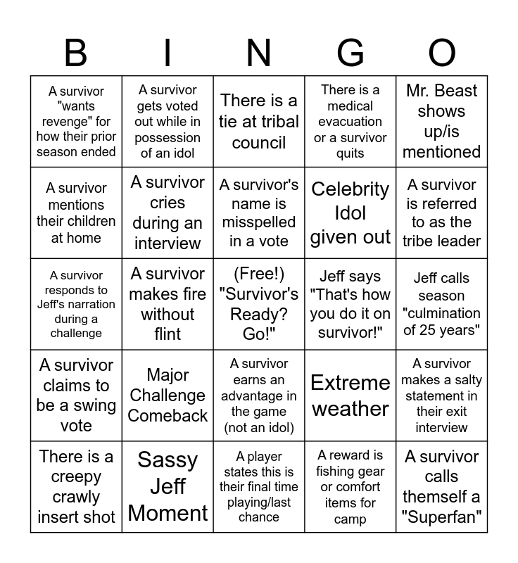This bingo card has a free space and 29 words: There is a creepy crawly insert shot, A survivor gets voted out largely due to past season play/reputation, A survivor makes fire without flint, A survivor calls themself a legend, A survivor "wants revenge" for how their prior season ended, There is a tie at tribal council, A survivor cries during an interview, Major Challenge Comeback, Jeff says "That's how you do it on survivor!", Sassy Jeff Moment, Jeff calls season "culmination of 25 years", A survivor calls themself a "Superfan", A player states this is their final time playing/last chance, A reward is fishing gear or comfort items for camp, A survivor is referred to as the tribe leader, A survivor finds a hidden immunity idol, A survivor earns an advantage in the game (not an idol), A survivor claims to be a swing vote, Mr. Beast shows up/is mentioned, A survivor responds to Jeff's narration during a challenge, Extreme weather, Talk or skepticism of a pre-show alliance, Celebrity Idol given out, A survivor mentions their children at home, There is a medical evacuation or a survivor quits, A survivor gets voted out while in possession of an idol, A survivor makes a salty statement in their exit interview, A survivor's name is misspelled in a vote and A survivor calls themself "old" or tribe mom/dad.