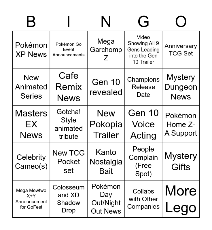 This bingo card has 25 words: New TCG Pocket set, Pokémon Day Out/Night Out News, Gen 10 revealed, Mega Mewtwo X+Y Announcement for GoFest, Anniversary TCG Set, Pokémon XP News, New Animated Series, Pokémon Go Event Announcements, Gen 10 Voice Acting, Kanto Nostalgia Bait, Champions Release Date, Masters EX News, People Complain (Free Spot), Mystery Gifts, Cafe Remix News, More Lego, Pokémon Home Z-A Support, Mega Garchomp Z, Mystery Dungeon News, Gotcha! Style animated tribute, New Pokopia Trailer, Colosseum and XD Shadow Drop, Celebrity Cameo(s), Video Showing All 9 Gens Leading into the Gen 10 Trailer and Collabs with Other Companies.
